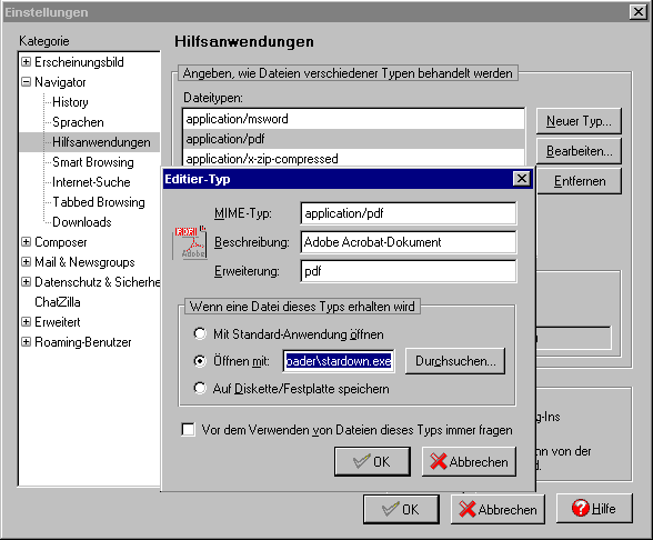 Dort kann man für jede einzelne Mime-Typ bestimmen, ob sie mit der Windows-Standard-Anwendung geöffnet oder zum Beispiel mit StarDownLoader zum herunterladen bereitgestellt werden soll - was beispielsweise automatisch beinhaltet, daß StarDownLoader erst einmal ansagt, wie groß die Datei überhaupt ist und dann erst auf Bestätigung die Datei zum Herunterladen im Mehrkanal-Verfahren in einen vorher bestimmten Ordner freigibt, das auch jederzeit unterbrochen und wieder aufgenommen werden kann - ein zumindest für bekannte Dateitypen äußerst beruhigendes Verfahren.