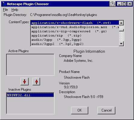 ! Achtung ! : Sea Monkey hat darüber hinaus die äußerst liebenswerte Eigenschaft, nach der völlig korrekten Bearbeitung oder Einführung von Dateitypen, insbesondere nach deren Verknüpfung mit StarDownLoader, die Datei "npstar.dll" kommentarlos aus dem Plug-In-Verzeichnis zu entfernen, wodurch natürlich nichts mehr geht. Also bitte auch diese Datei vorher sichern und in diesem Fall Sea Monkey schließen und die Datei "npstar.dll" wieder hineinkopieren.
